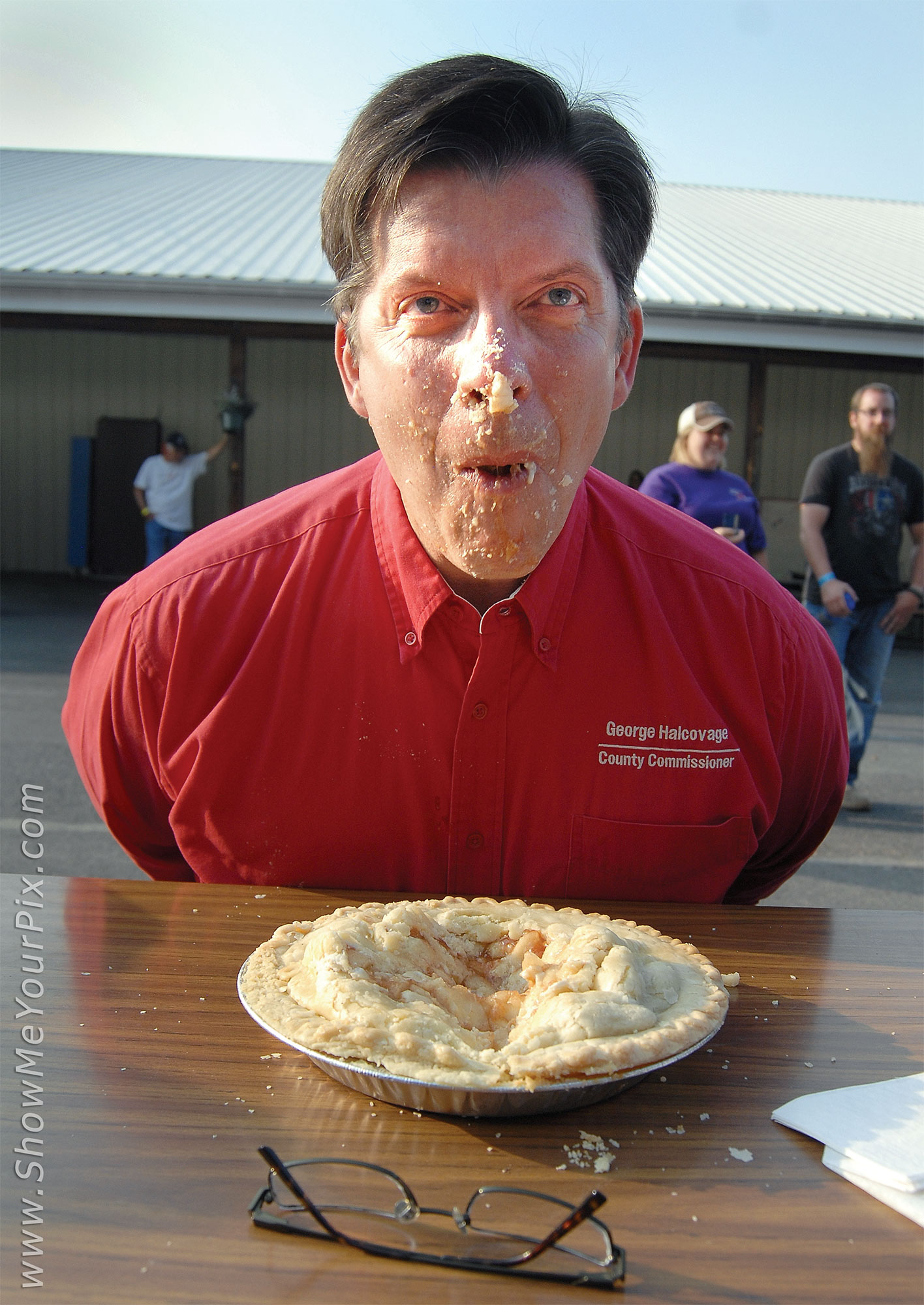 Schuylkill County Commissioner George F. Halcovage Jr. competes in a pie eating contest.